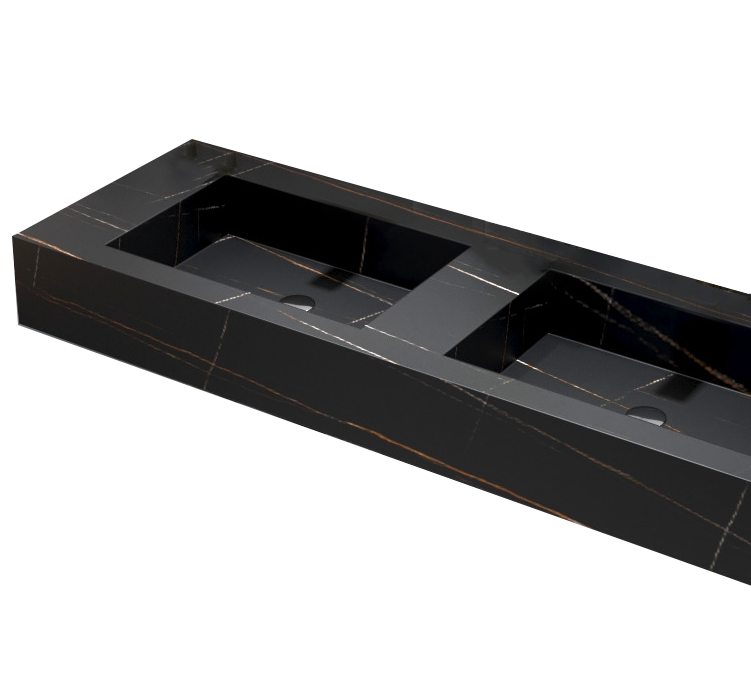 The countertop material of this double basin bathroom vanity is slate, which has an elegant texture effect. The black finish with espresso solid wood drawers creates a modern fashion high-end vibe. This bathroom vanity is not only good in look but also performs well in daily life.